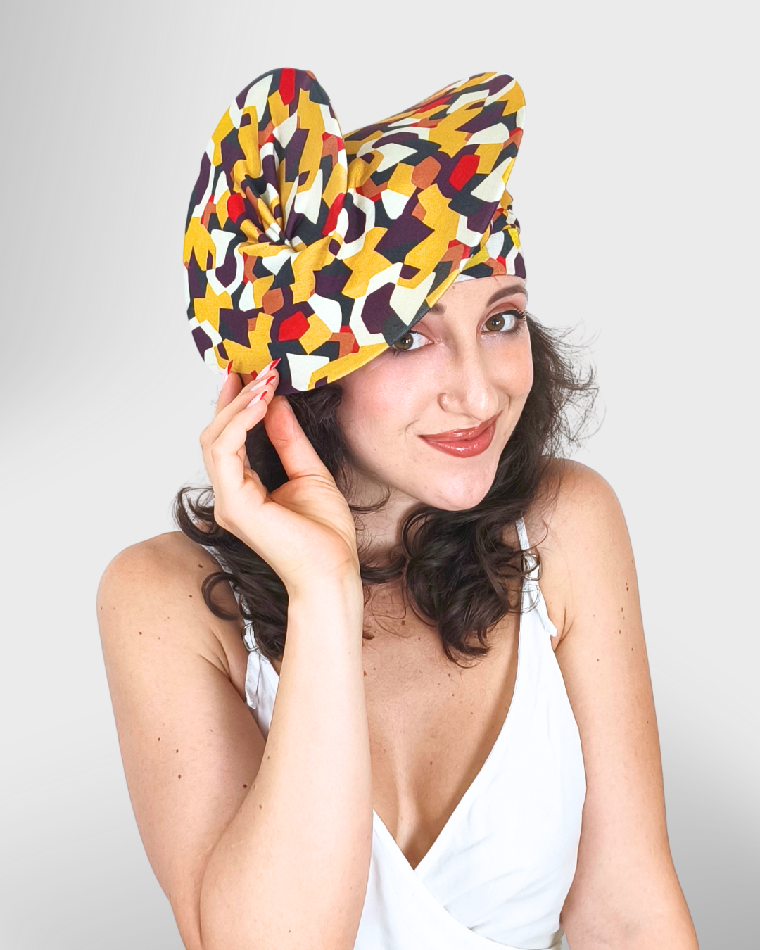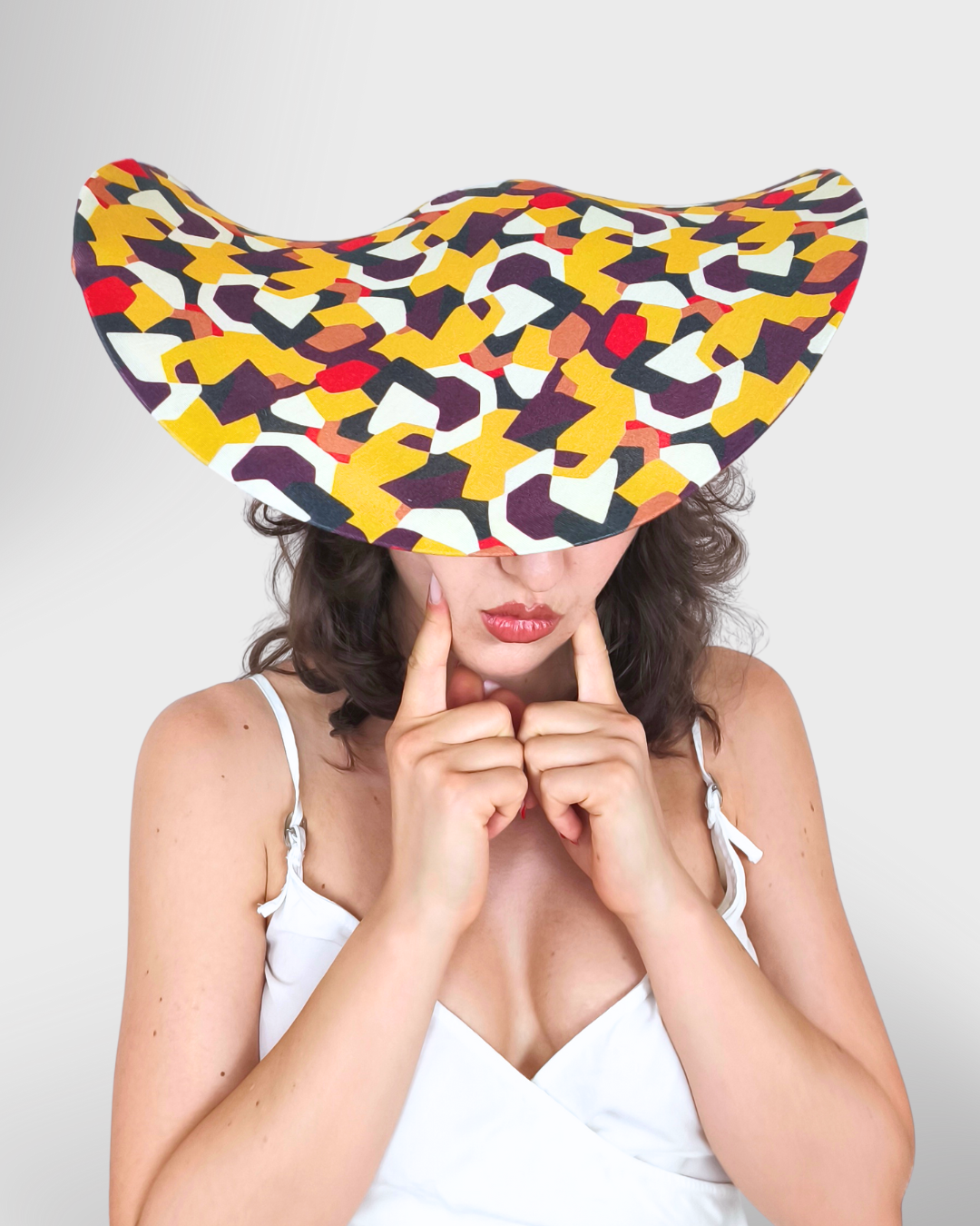 A jersey hat decorated with a ’60s-inspired optical pattern, evoking the elegance and retro charm of an iconic era.